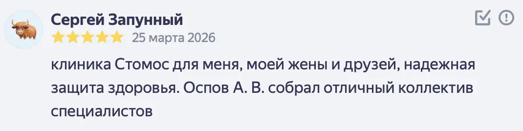 Клиника Стомос для меня, моей жены и друзей — надежная защита здоровья. Осипов Андрей Викторович собрал отличный коллектив специалистов.