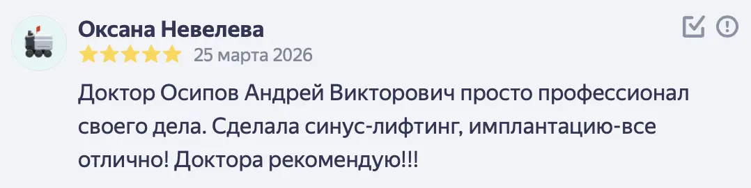 УспешныхДоктор Осипов Андрей Викторович просто профессионал своего дела. Сделала синус-лифтинг, имплантацию-все отлично! Доктора рекомендую!!!