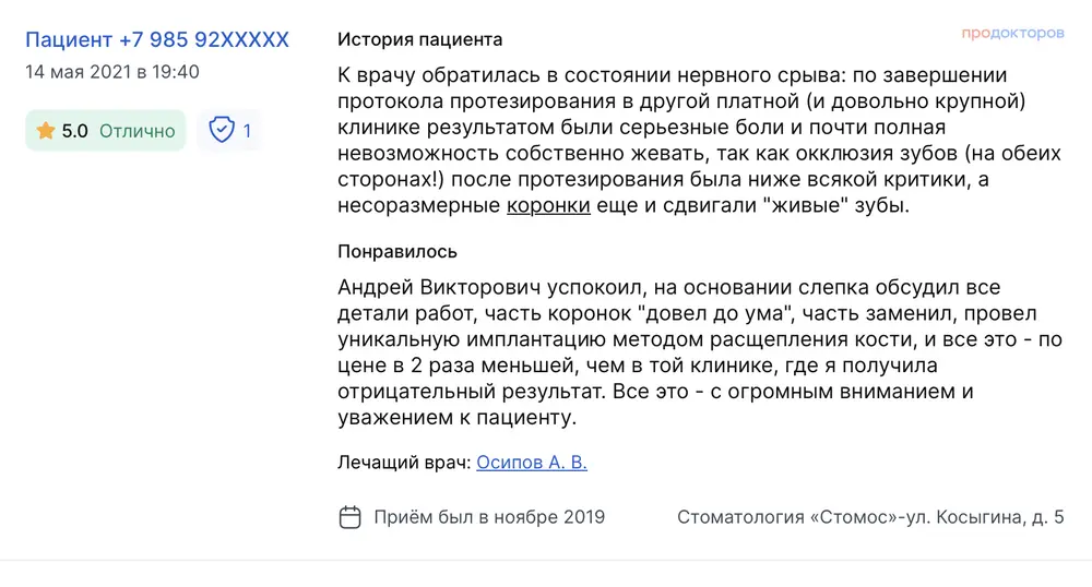 Очень хорошая стоматология, всем рекомендую! Обратилась в "Стомос" с конкретной проблемой. Несколько лет назад потеряла нижние и верхние пятерки — один за другим. При этом остальные зубы были норм. Но заметила, что началось смещение — зубы начали как бы разъезжаться, хотя это не было сильно заметно. В клинику обратилась по совету знакомой. Попала к самому Осипову на консультацию. Он предложил решить проблему с помощью установки имплантов. В этом случае можно было обойтись без мостов, а значит, сохранить целыми соседние зубы. То есть на имплант потом просто устанавливается коронка. Все лечение заняло где-то месяцев восемь. Доктор пошел по классическому пути двухэтапной имплантации. Операции прошли успешно, дискомфорт в послеоперационный период был минимальным. Процесс реабилитации тоже прошел отлично и без осложнений. Результат меня устроил полностью. Плюс очень понравился врач и его отношение ко мне. Могу смело рекомендовать доктора Осипова другим пациентам.