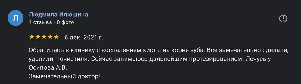 Я-пациент со стажем. Лечу зубы в этой клинике уже много-много лет, даже помню прежнее название " Клиника доктора Осипова". И это говорит о том, что врачам, работающим здесь, всецело можно доверить свои зубы. Андрей Викторович Осипов собрал сильную команду профессионалов: Бычков А.А, Котелевский E.О. и особо хочу отметить хирурга с золотыми руками и золотым сердцем Тернового Евгения Михайловича и его ассистентку Алину. Клиника с современным оборудованием, приветливые сотрудницы на ресепшн. СПАСИБО. С уважением, Людмила Павловна.