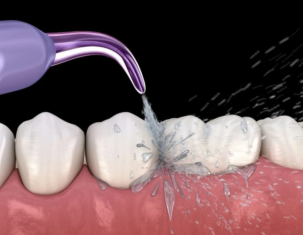 Аппаратом чистят не только зубы, но и промежутки между ними, где часто скапливаются остатки пищи, а также десны и другие труднодоступные участки. Процедура имеет минимальное количество противопоказаний. Кристаллы абразивного вещества (обычно это пищевая сода) имеют небольшие размеры, поэтому не повреждают эмаль, но при этом прекрасно удаляют камни и пигмент. После чистки эмаль становится светлее на несколько тонов.
