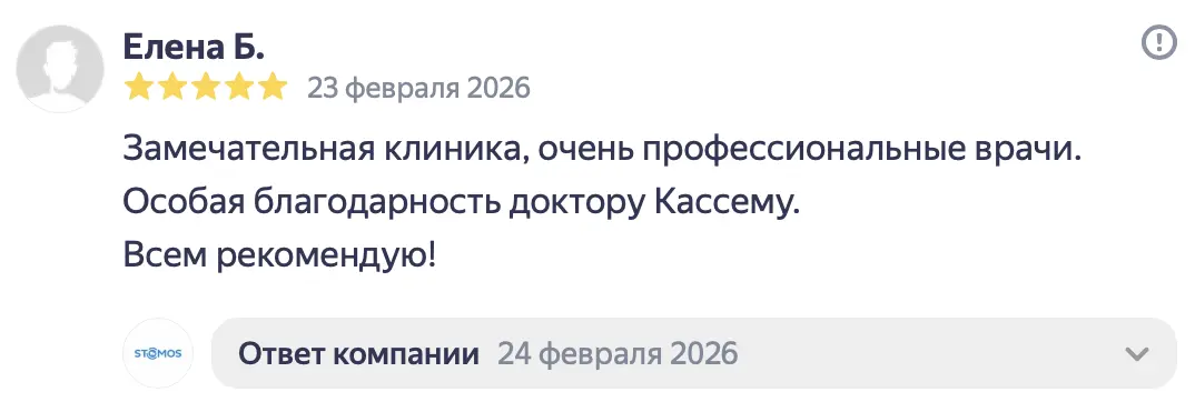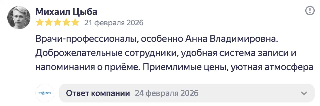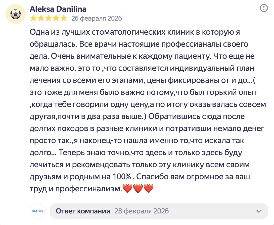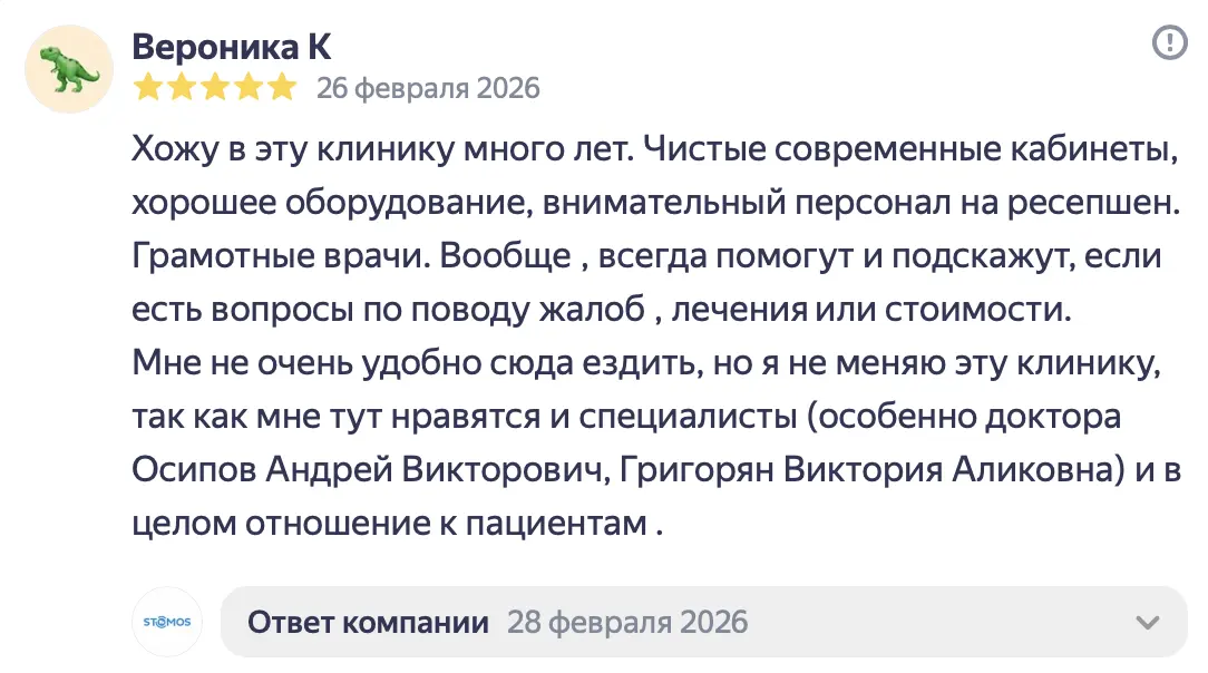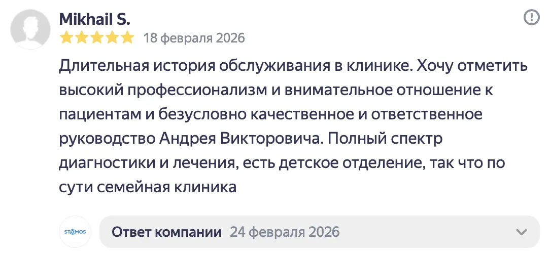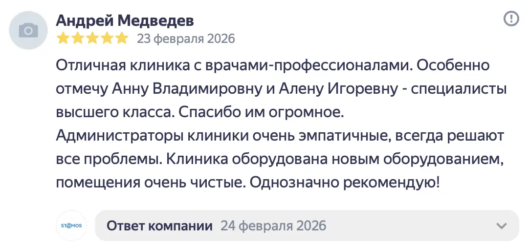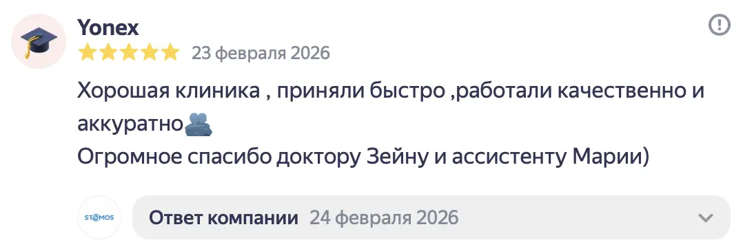 Летом 2025 года у меня раскололся 4-ый зуб сверху. Я обратилась в стоматологию «Стомос», ранее в эту клинику обращались с ребёнком, ставили пломбу и все прошло отлично. Поскольку я находилась в положении, то лечение для меня не предоставлялось возможным (отказалась делать КТ). Мне оказали первую помощь, убрали сколотую часть и тем самым купировали боль. Само лечение и постановку коронки мы решили перенести на потом, после родов. В январе, уже 2026 года, мой зуб, вернее то, что от него оставалось, раскололся ещё раз. Я экстренно обратилась в «Стомос». Тут-то за меня и взялся Кирилл Сергеевич. Мне сделали КТ и выявили скрытое воспаление, которое, на секундочку, длилось целых 7 лет. Было воспаление нерва, оно запустило череду последствий, в том числе и воспаление канала 4-го зуба. Кирилл Сергеевич человек вежливый, который располагает к себе, настоящий профессионал своего дела. Все его действия сопровождались объяснением на «человеческом» языке, были озвучены все последствия, тех или иных решений и в конечном итоге, Кирилл Сергеевич подобрал самый наилучший вариант по восстановлению моего зуба в моём, не совсем простом, положении дела. Спасибо вам огромное за неравнодушное отношение к клиентам и за то, что делаете наши улыбки здоровыми и красивыми!