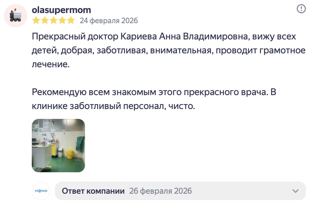 За последние шесть месяцев мы с дочерью несколько раз обращались к детскому стоматологу в клинике "Стомос". Я всегда была приятно поражена высоким уровнем сервиса, профессионализмом врачей и их заботой. Благодаря такому подходу нам удалось избавить ребёнка от боязни посещения стоматолога. Моя дочь с удовольствием приходит на приём, так как уверена, что ей помогут и не причинят боли! Это крайне важно для формирования позитивного отношения к лечению зубов у детей. Также я оценила удобство записи на приём через веб-сайт клиники, возможность выбрать подходящее время для визита и получить онлайн-консультацию специалиста. Это позволяет нам экономить время и заранее планировать посещения. В общем, мы довольны работой детского стоматолога в клинике "Стомос". Понравилось Профессионализм медперсонала, приятная атмосфера, знают грамотный подход к детям.