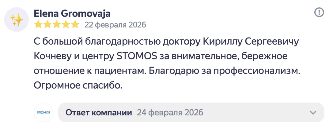 С большой благодарностью доктору Кириллу Сергеевичу Кочневу и центру STOMOS за внимательное, бережное отношение к пациентам. Благодарю за профессионализм. Огромное спасибо.