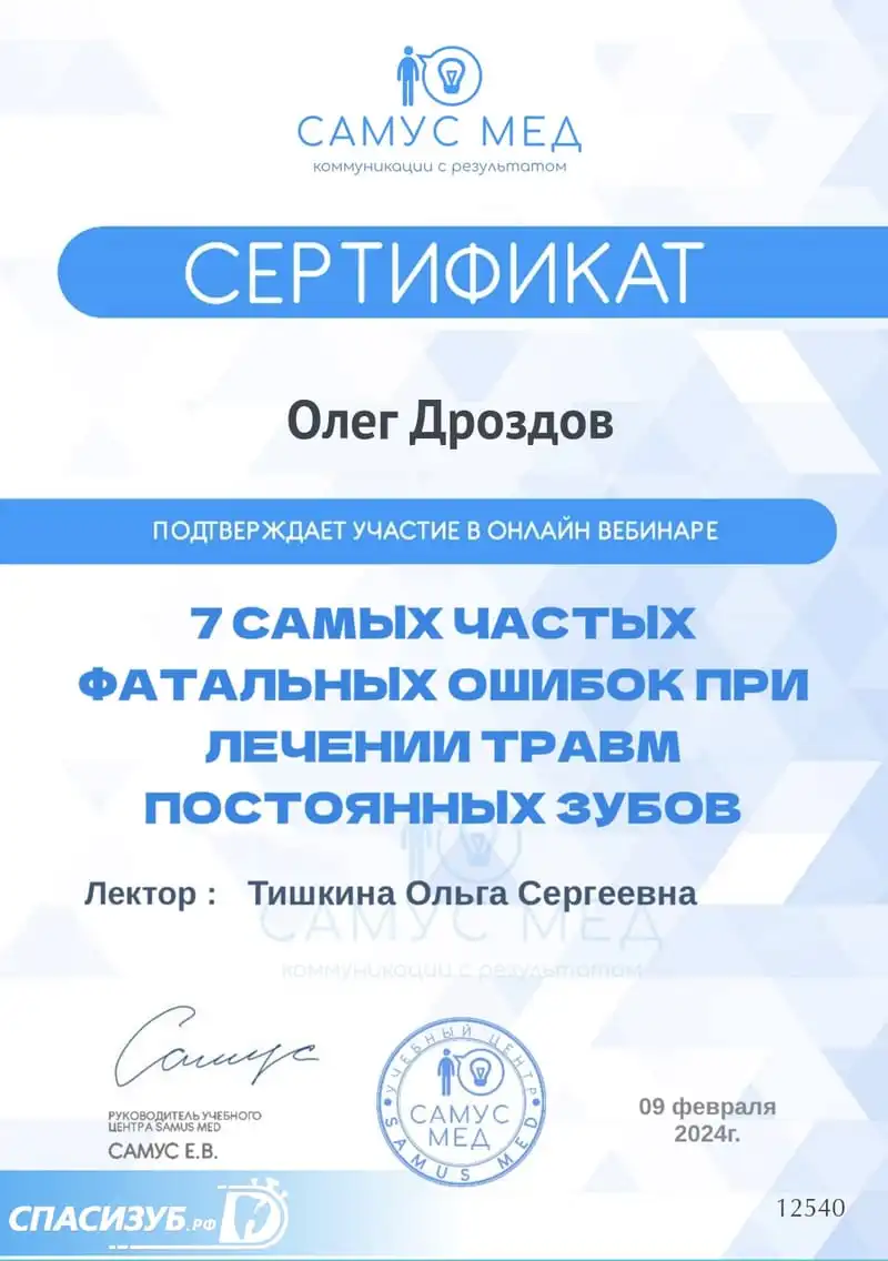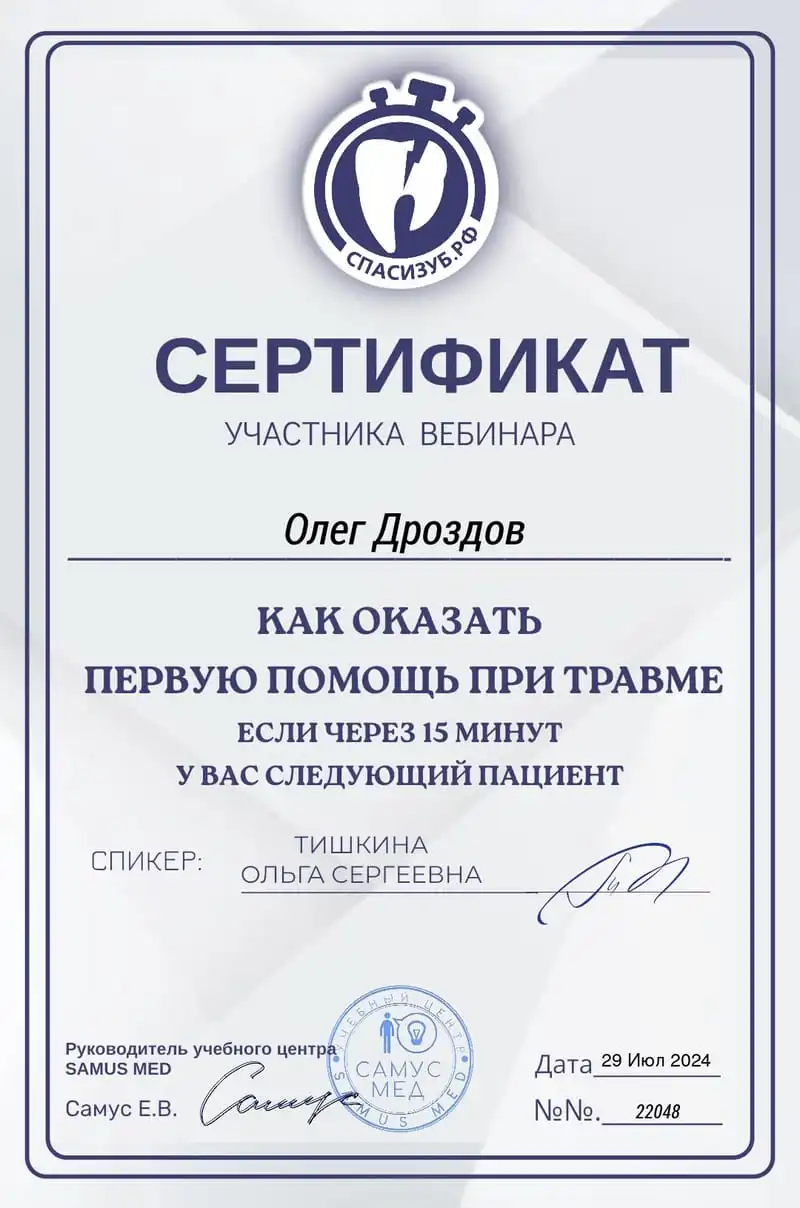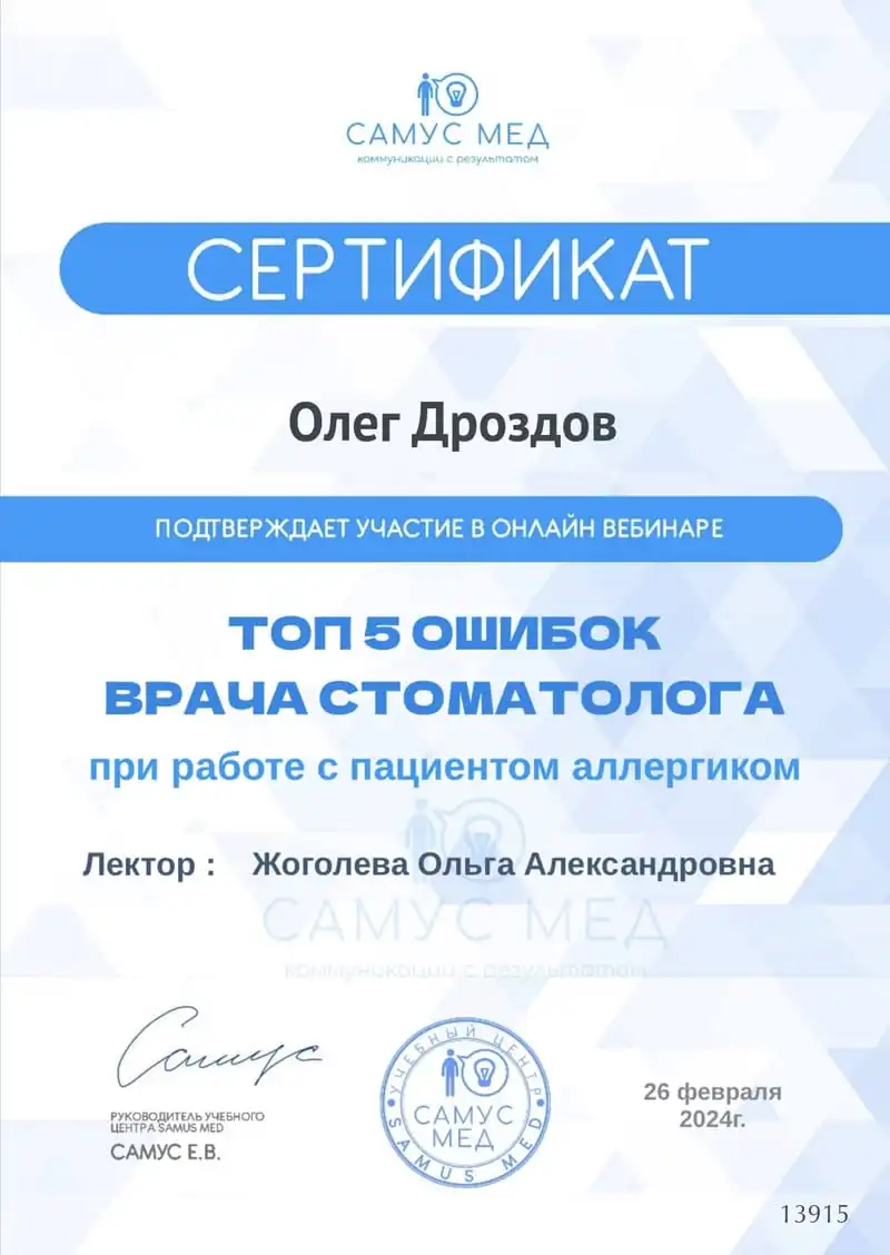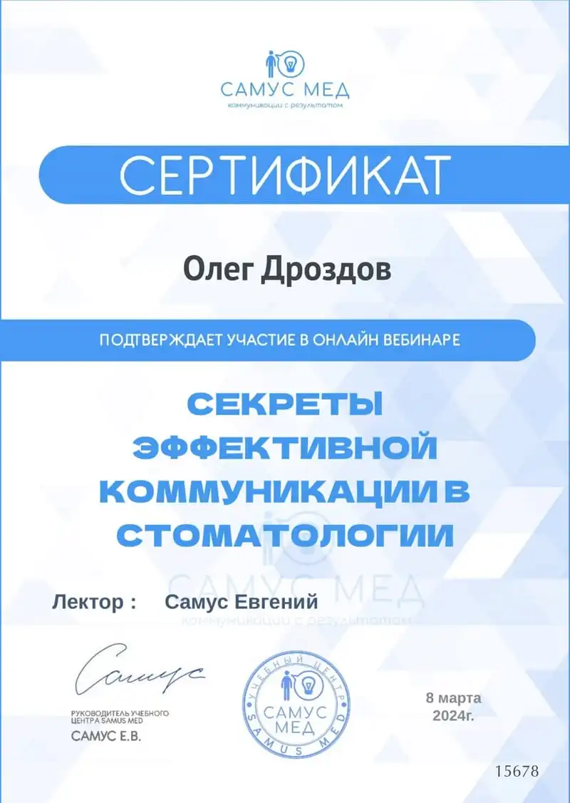 Хочу выразить огромную благодарность врачу-стоматологу Олегу Вячеславовичу Дроздову за профессионализм и индивидуальный подход! Обратилась с серьёзной проблемой, но, благодаря его опыту и современным методам лечения, всё прошло идеально. Каждая процедура сопровождалась чёткими объяснениями, что сразу успокоило и помогло чувствовать себя уверенно. Результат превзошёл ожидания - зубы здоровые, а улыбка стала по-настоящему красивой! Олега Вячеславовича смело рекомендую тем, кто ищет не просто врача, а мастера своего дела. Такого внимательного, терпеливого и компетентного специалиста встречаешь редко. Спасибо за здоровье и прекрасное отношение!