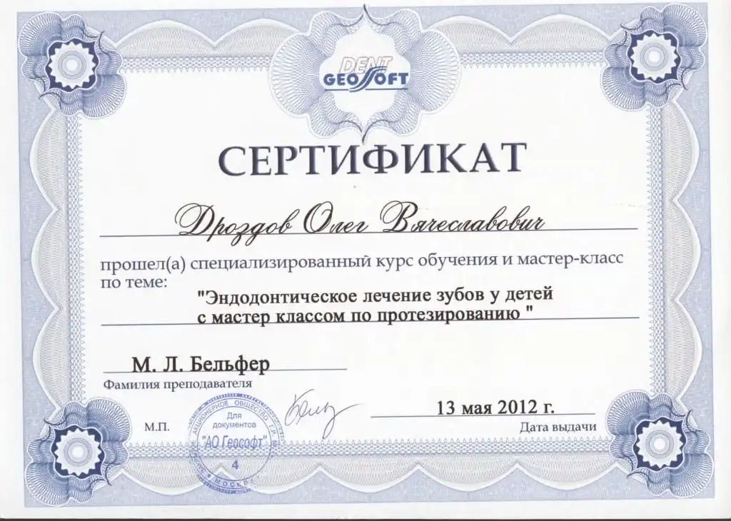• 2012 г. «Эндодонтическое лечение зубов у детей с мастер классом по протезированию», М. Л. Бельфер.