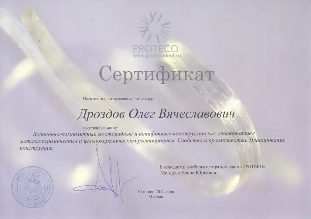 • 2012 г. «Волоконно-композитные мостовидные и штифтовые конструкции как альтернатива металлокерамическим и цельнокерамическим реставрациям. Свойства и преимущества. Планирование конструкции», Мендоса Е.Ю.